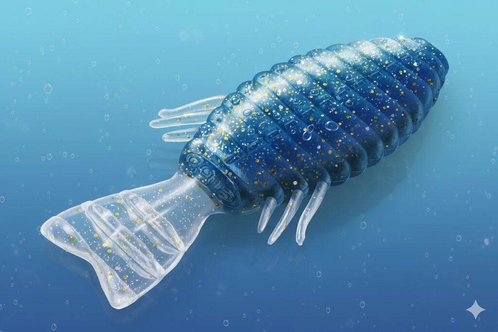 ブルフラットは、デプス社が開発したギル型ワームで、全長約4インチ前後のボディに独自設計のテールを備えています。そのデザインは、野生のブルーギルの泳ぎや逃げ方を忠実に再現することを目的としており、従来のストレートワームでは再現しにくかった自然な水中挙動を実現しています。特にスパイラルフォールは、ワームが水中でゆっくりと回転しながら落下する動きで、バスの捕食本能を刺激することで知られています。一方、スライドフォールはワームが斜め方向に滑るように沈む動きで、逃げるギルの自然な軌道を再現し、バスのリアクションバイトを誘発します。